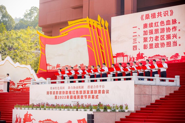 活动现场由17个市州政协主席宣读湘鄂渝黔红色旅游协作《桑植共识》。四省(市)各派一名代表共同登台宣读《桑植共识》,象征着四省(市)齐心协力传承红色基因,共建新时代长征路。