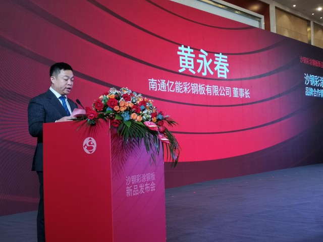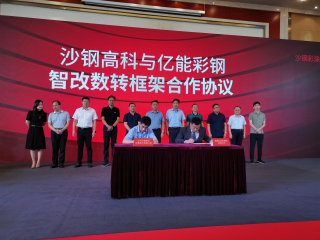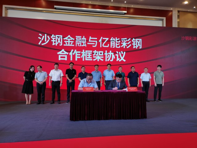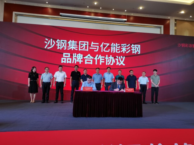 发布会上,南通亿能彩钢与沙钢集团共同签署战略合作协议,根据协议内容,南通亿能获得生产和销售沙钢牌彩涂钢板的资质授权,双方将在品牌、金融、智改数转等领域进行深化合作。发布会上,沙钢彩涂钢板品牌正式发布。