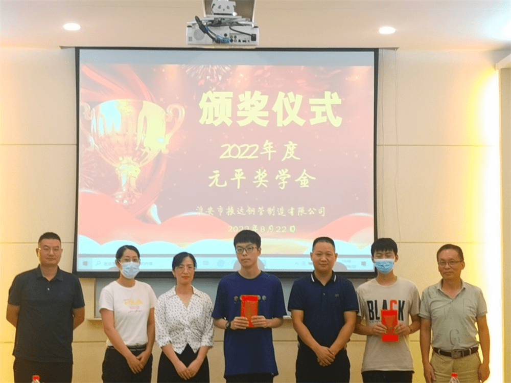 8月22日下午,淮安市振达钢管制造有限公司隆重举行2022年度暨第五届“元平奖学金”发放仪式。公司总经理张朝阳、财务总监杨敏、副总经理权秀和总助薛秋等莅临现场,获奖学子及家长、往届获奖学子代表等参加本次活动,副总经理荣益民全程主持。