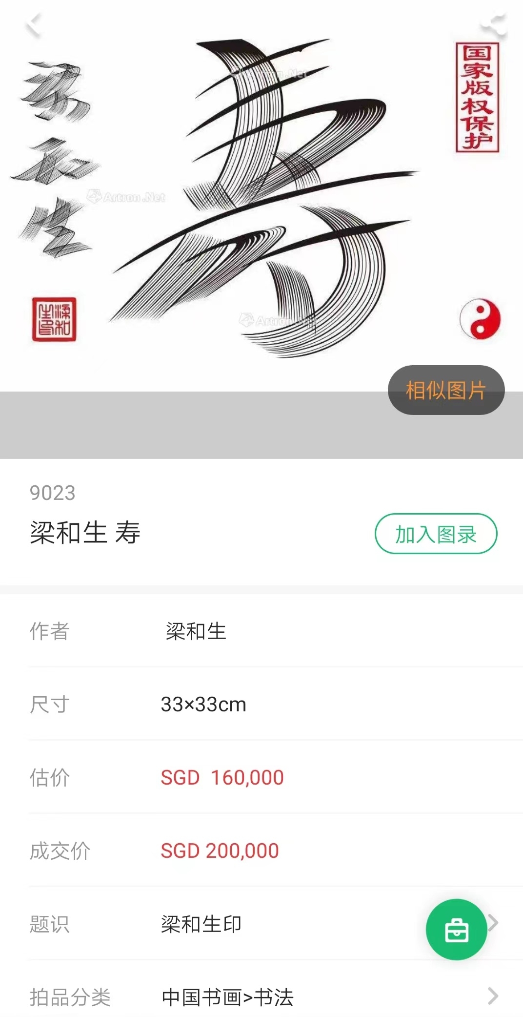来自雅昌网消息:由新加坡亚轩(东南亚)拍卖有限公司举办的2022“大美中国”书画展览暨拍会于2022年8月26日在新加坡亚庭假日酒店隆重举行!本次总成交额达146万新加坡币 ,约和人民币2920万元,成交率达93.33%,其中由中国大陆书法家梁和生创作的书法作品《寿》字以20万新加坡币拍出,约合人民币101万元!