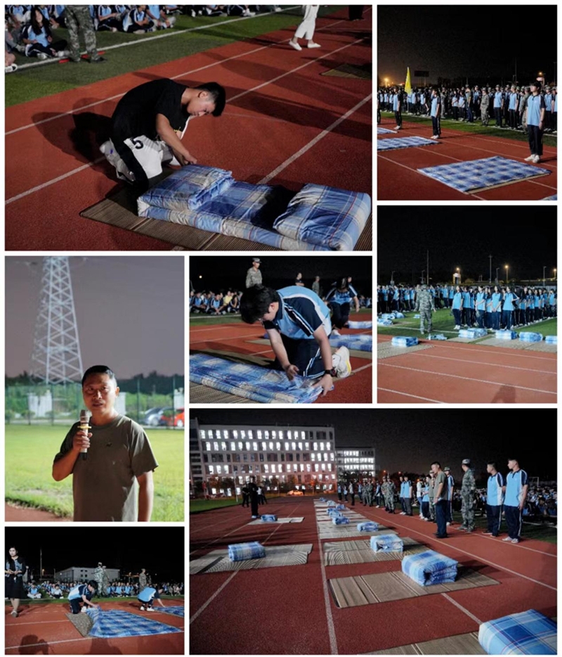 9月5日晚,江苏省淮安工业中等专业学校的绿茵操场上,2022级的新生正在接受着“新兵营训练”叠被子。