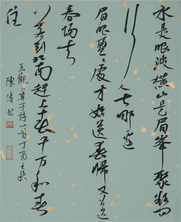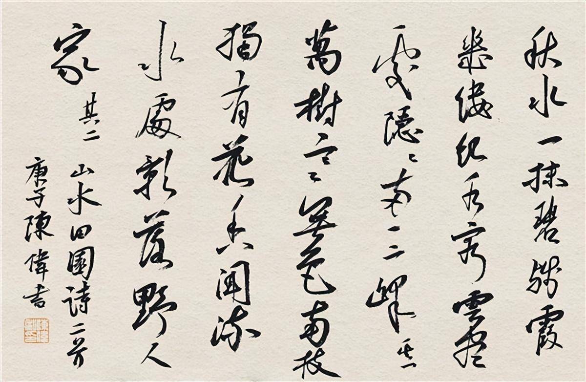 陈伟为人谦和,重友情,讲艺德。每有新作,必前往师友处虚心求教。在众多书体中,他独爱行草书,洗练的线条,清雅的气息,赏之如沐清风,如饮甘泉。偶尔,还会发现他的一些行草书作品是兴之所至,直抒胸臆,所以常常是挥毫点洒,奋笔立就。他的的书法之所以“逸笔清雅”,是建立在对中国传统书法的深刻理解和潜心研究的基础上的,是来源于传统,又能厚积薄发的逸笔从容。