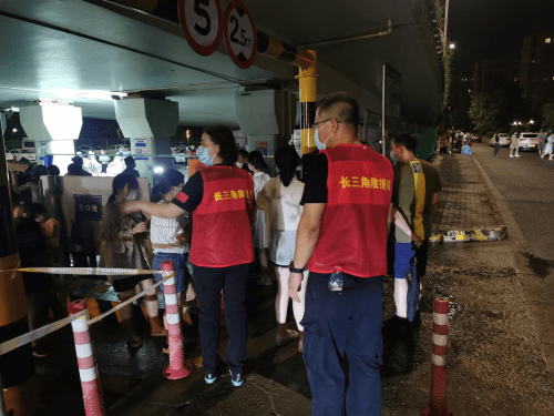 继台风预警之后,9月3日我市某公司培训中心又出现了新冠疫情。根据疫情防控需要,余姚市新型冠状病毒肺炎疫情联防联控领导小组决定,在我市阳明街道、兰江街道开展3轮区域全员核酸检。我队立即启动应急预案,当天傍晚根据街道安排,长三角18位志愿者积极响应,有的连晚饭都来不及吃,分别前往龙泉社区、金色兰庭社区、开封桥下(姚江社区)临时点参加到紧张的检测点保障工作。开封桥下灯光不够,几个电力公司志愿者马上拉线放灯,确保检测工作顺利进行。他们冒雨前行不惧风险、无私无畏,一直到晚上九点,才带着疲惫和汗水结束了第一天的紧急任务。