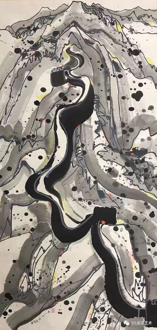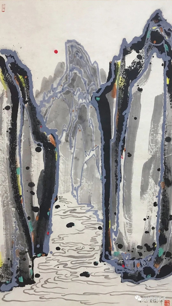 就好比从物质媒介的角度来看,许多山边色彩的勾勒都是运用丙烯完成的,运用丙烯干净、鲜亮的物质特性,调出“现代”灰与水墨的黑达到完美结合。