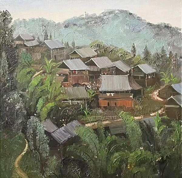 从题材上来看,我们从吴先生的画面中不会感到压力、不会感到强大的过度的振奋。平静、屏气凝神、心静。一轮圆日斜着头挂在山间,山间溪水嬉闹,浸泡着巍峨山体。有时候静静看事物,便会发现这世间每个人都是必不可少的部分,只有缺一不可的搭配,才会有和谐应运而生,吴先生的山是幅人生哲理画卷,认真做好当下事,每个人都会很幸福,就像吴先生笔下象征性几个红衣绿袍为着生活简单快乐的艺术形象们。