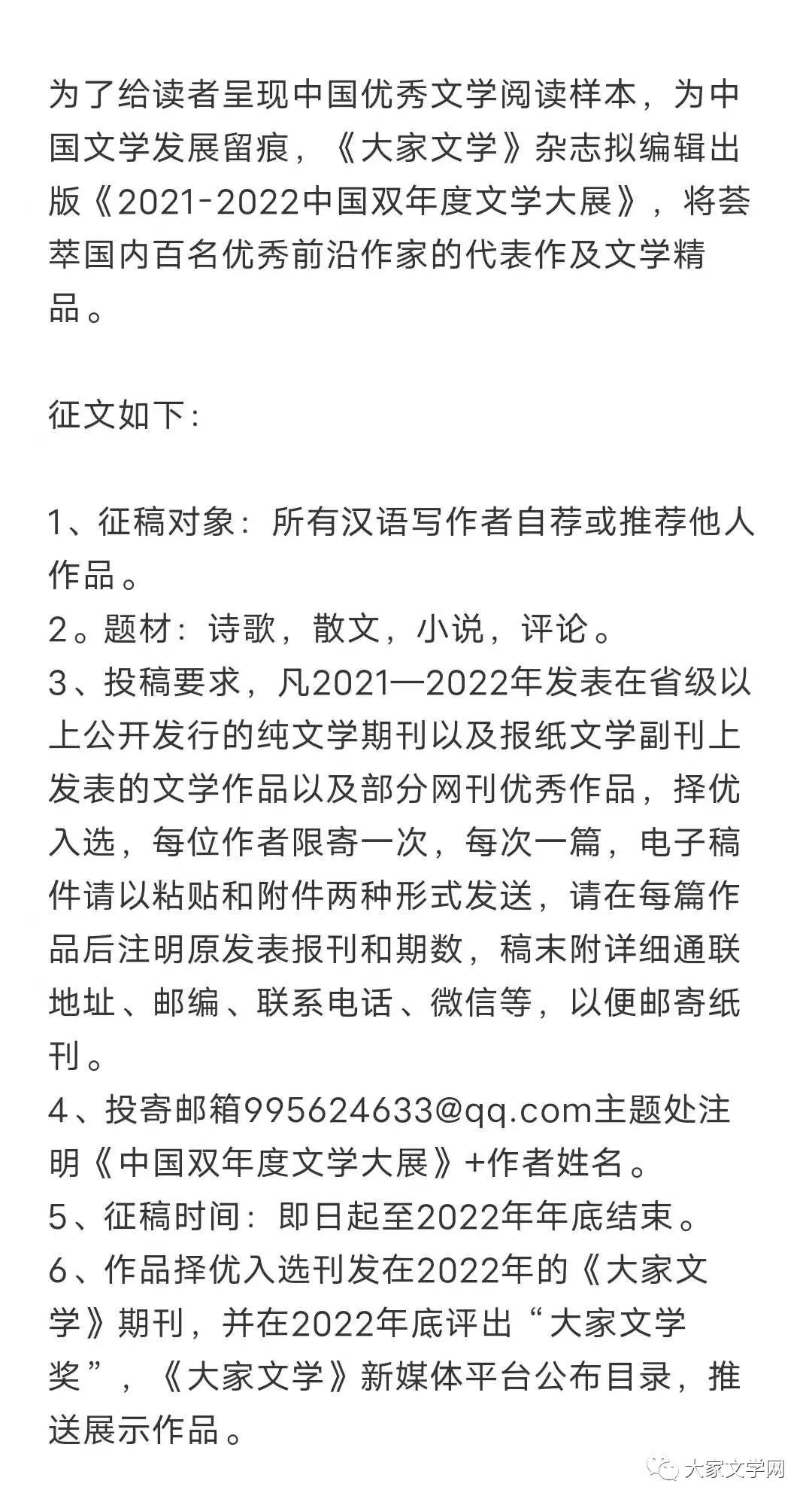 《2021—2022中国双年度文学大展》征稿启事