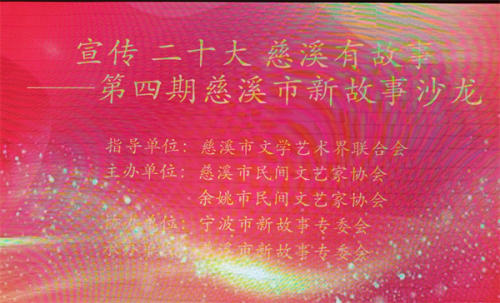 本次活动由慈溪市文学艺术界联合会指导,余姚民间文艺家协会和慈溪民间文艺家协会共同主办,宁波市新故事专委会协办。活动分为新故事座谈会、新故事讲座、新故事沙龙改稿会三项。