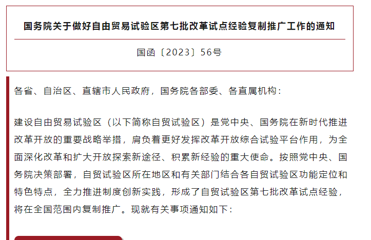 7月10日,国务院发布通知,在全国范围内复制推广自由贸易试验区第七批改革试点经验,共涉及到投资贸易便利化、政府管理创新、金融开放创新、产业高质量发展、知识产权保护等五大领域的24项创新举措在全国推广。其中,由国家知识产权局、中国人民银行、金融监管总局负责推广的“知识产权质押融资模式创新”成功入选,岳阳自贸片区知识产权质押融资风险补偿机制为该创新提供了样本做法。
