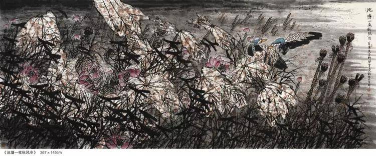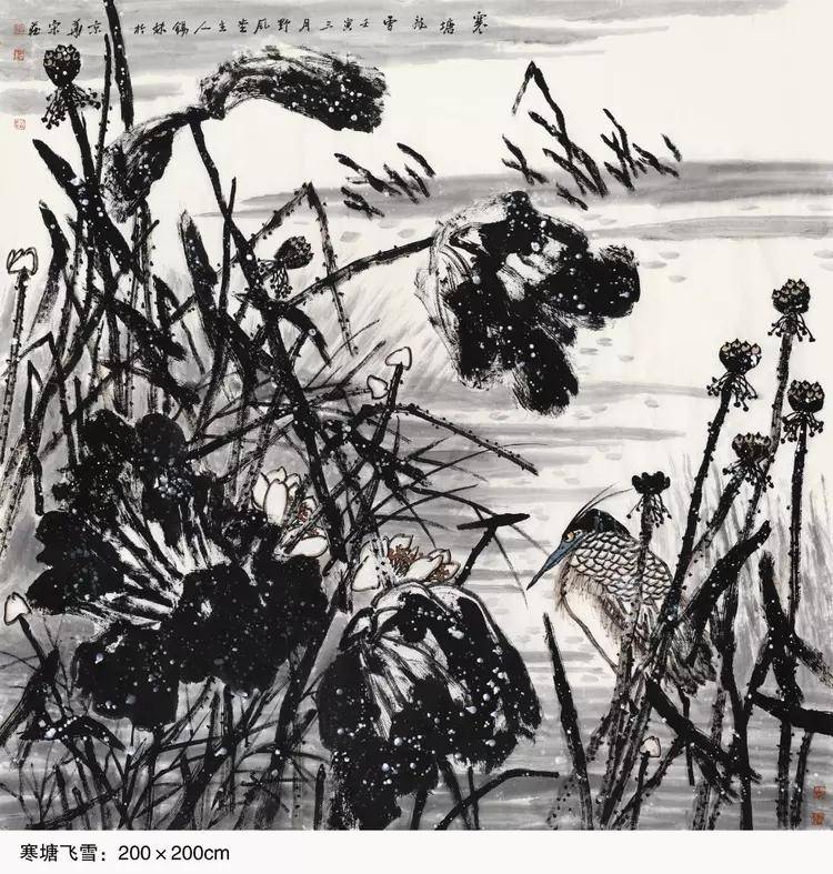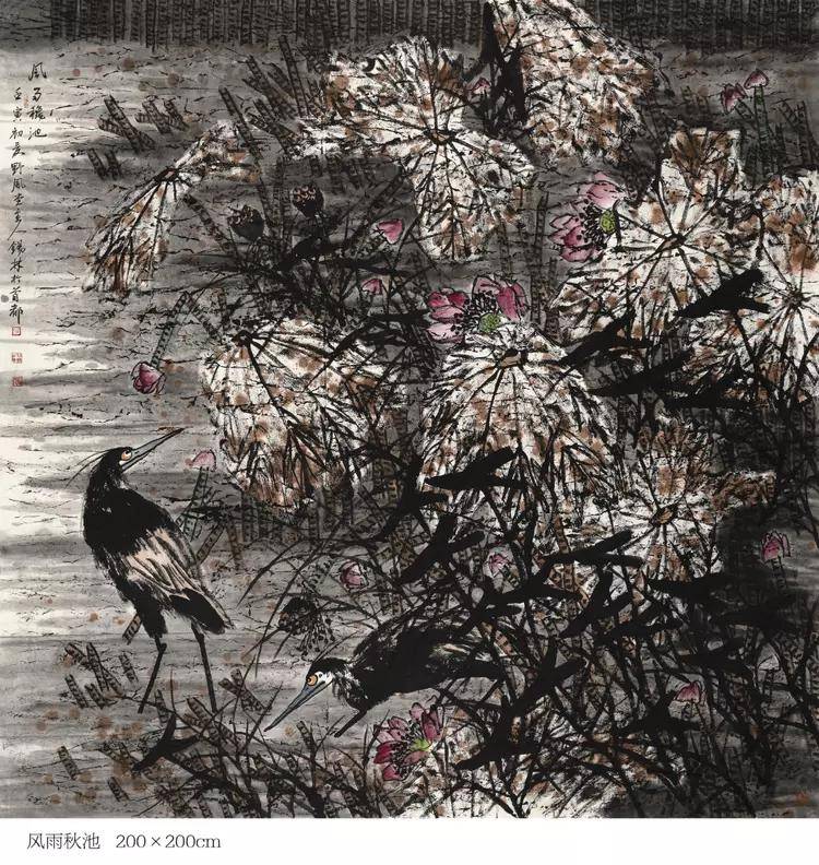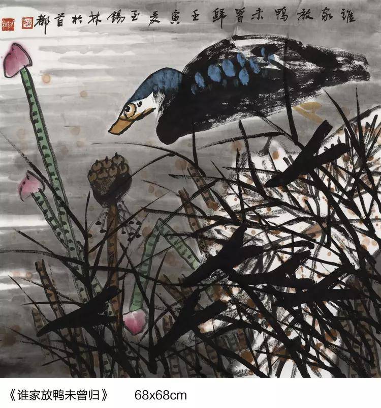 得益于对传统文人画的一脉相传,潘锡林先生的画作题材自然也 是有博涉诸多,但其中最为出众的,还是要数其所绘的众幅荷花、 鸡、鹤之作!首以荷花来看,画中荷花虽是以豪放之情描绘风骨,但 整体的荷花气象,却也仍然不失于一种出淤泥而不染和濯清涟而不妖 的君子雅气!用笔皆以浓墨点染花叶,荷叶茎秆繁而不乱,花卉绽放 妙而不娇,赋色之际,更是可依随类赋彩之真谛,使其墨不碍色,色 亦不碍墨,而如此一幅荷塘景色,观之也诚可谓是心性所驱也,老笔 纷扬,生机可见,精神空间,一目了然!而经由潘锡林先生所绘作的雄鸡,也更是可堪当下一绝!其画鸡功底,是以写生观察为基础,继而在长年累月的积淀中将其形神了然于心,用笔构其骨肉,用墨展其 神气,当然,潘锡林先生的雄鸡创作技法也并不仅仅只是有体现在传 统的笔端,手指画作亦是独具一格,创作之时,手与掌皆蘸于墨,细 处乃以指腹勾勒出形,粗处则以掌侧痛快出势,此是谓既有传统之根 基,又不失于新意之渗透!而那属于五德君的文、武、仁、勇、信品 质,也皆是可在此画面中雅俗同赏!