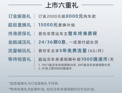 “金融减压礼”为消费者提供了24期或36期0息的金融服务。如果按照一成首付超长贷的购车方式来看,捷途旅行者入门版车型的首付金额为13990元+保险费用,后期月供不过3500元每月,大幅降低了消费者的购车压力。“等待惊喜礼”是对消费者的保障服务,如果捷途汽车在承诺交车周期内没有完成交付,会向消费者补偿1000捷途币/天(补偿上限30000捷途币)。