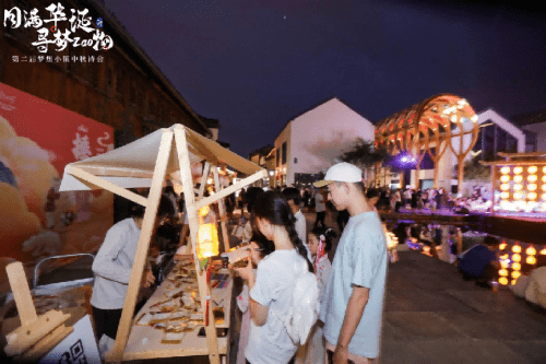 除了中秋诗会,现场还开设了主题游园市集和集章打卡活动,香味扑鼻的美食摊位、好玩有趣的手作体验、古风古韵的汉服摊位…游客只要在六处商家店铺参与集章活动,全部完成后即可领取梦想小镇纪念品⼀份!活动妙趣横生,参与的游客络绎不绝。
