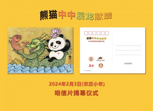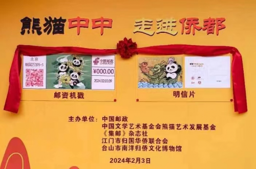 2024年2月3日,在南方小年到来之际,中国邮政携手中国文学艺术基金会熊猫艺术发展基金、《集邮》杂志社,和江门市台山市南洋归侨文化博物馆,在京、江两地同时发布、启用“熊猫中中辰龙献瑞”明信片及邮资机戳,为全国集邮爱好者营造了龙年新春佳节的喜庆氛围。