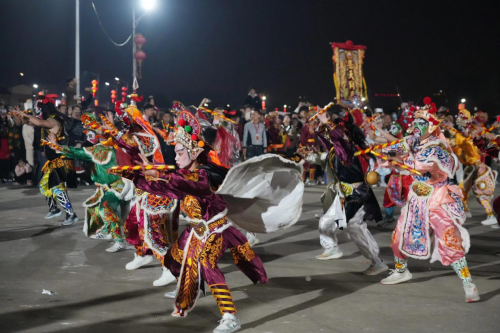 春节意犹未尽,元宵佳节又至。2月24日晚,位于潮南区两英镇鹤丰村的海洋妈祖天后宫门前广场人头攒动、灯火通明,一场闹元宵的英歌舞巡游展演在此举行,锣鼓声、呼喊声此起彼伏,将元宵节日氛围感直线“拉满”。