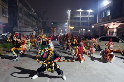 “一声哨子响,千百棍子敲”,为营造热烈喜庆祥和的节日氛围,今年,潮南区海洋英歌协会精心策划本次展演巡游活动,协会所属的天后海洋英歌队积极备战,与村民一起欢度元宵节。