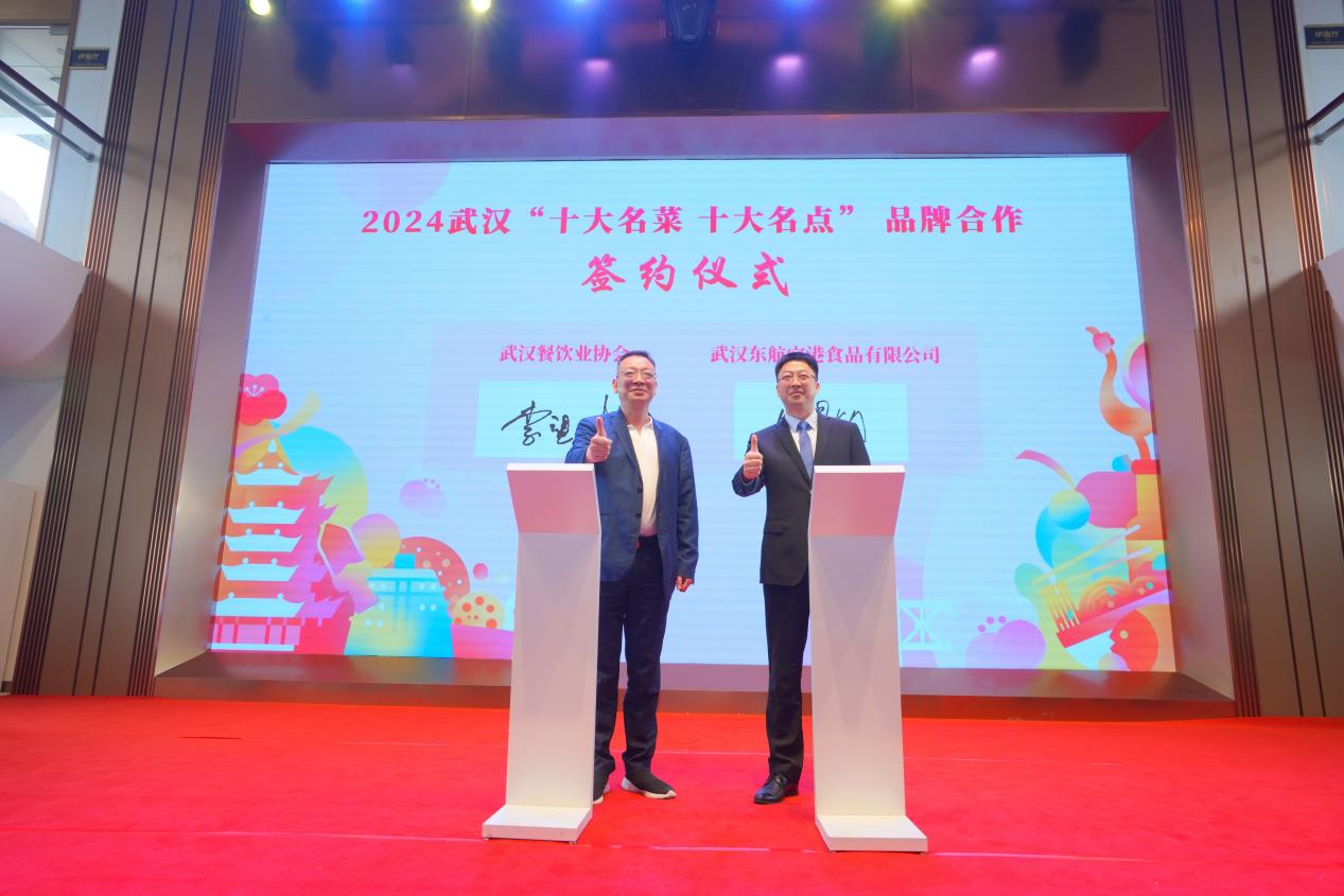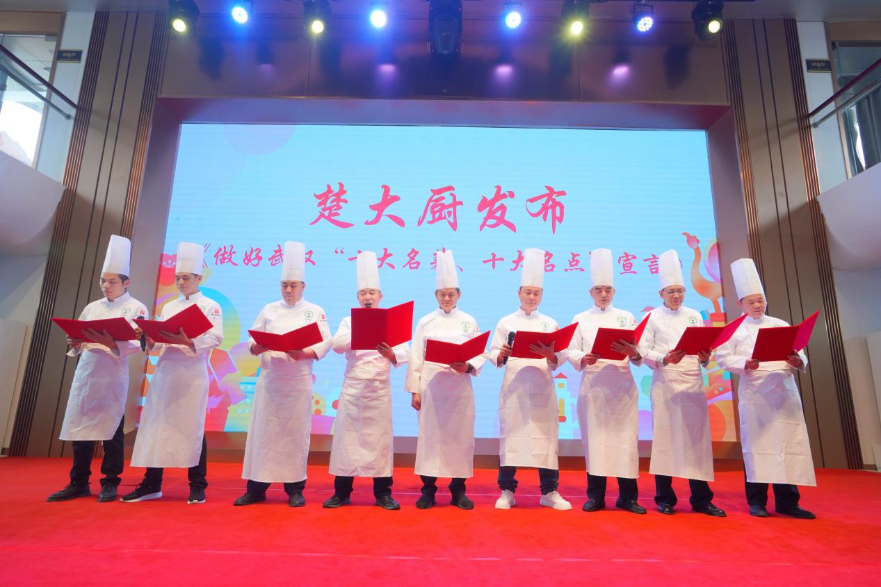 在发布会现场,刚刚赴法国和德国推广楚菜载誉而归的九位楚大厨精彩亮相,他们身着统一服装、庄严宣誓,共同发布了《做好武汉“十大名菜、十大名点》宣言:要用好“十大名菜、十大名点”公共品类,打造“名菜、名点”招牌菜,持续擦亮武汉“中国十大旅游美食城市”名片。与此同时,武汉餐饮业协会也与武汉东航空港食品有限公司达成了合作,双方将整合名厨及供应链资源,推荐适合东航武汉公司需求的航空餐食,打造“空中的名菜名点”。