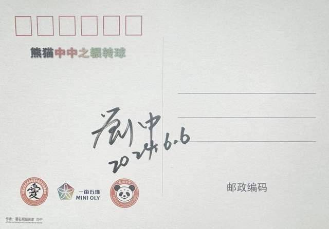 著名熊猫画家刘中签名的“熊猫中中之辗转球”国版明信片背版