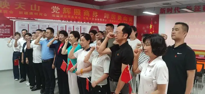 党旗映天山,党辉照商界,踔厉勇向前!向党而生,沐浴党恩,为党生金!