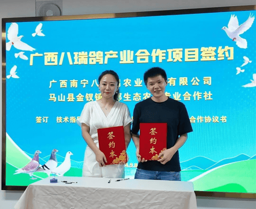 17 时 50 分,现场迎来了激动人心的签订合作协议书环节。广西南宁八瑞鸽农业科技有限公司分别与广西三和佰草农牧产业发展有限公司、马山县金钗镇金那生态农业专业合作社、广西大学生就业创业联盟、广西芸健康技术集团有限公司等10多家企业签订了技术指导、种鸽提供、负责保价回收、销售代理、就业创业、旅游研学宣传等多方面的合作协议书。最后,发布会还举行了工厂加工基地揭牌仪式和组织参观了八瑞鸽的加工厂,让大家近距离了解了八瑞鸽的生产环境和加工过程。了解了八瑞鸽的生产环境和加工过程,鸽肉丸子的加工,除了带动养殖一产的高质量发展,还带动了二产和三产的迅速发展。