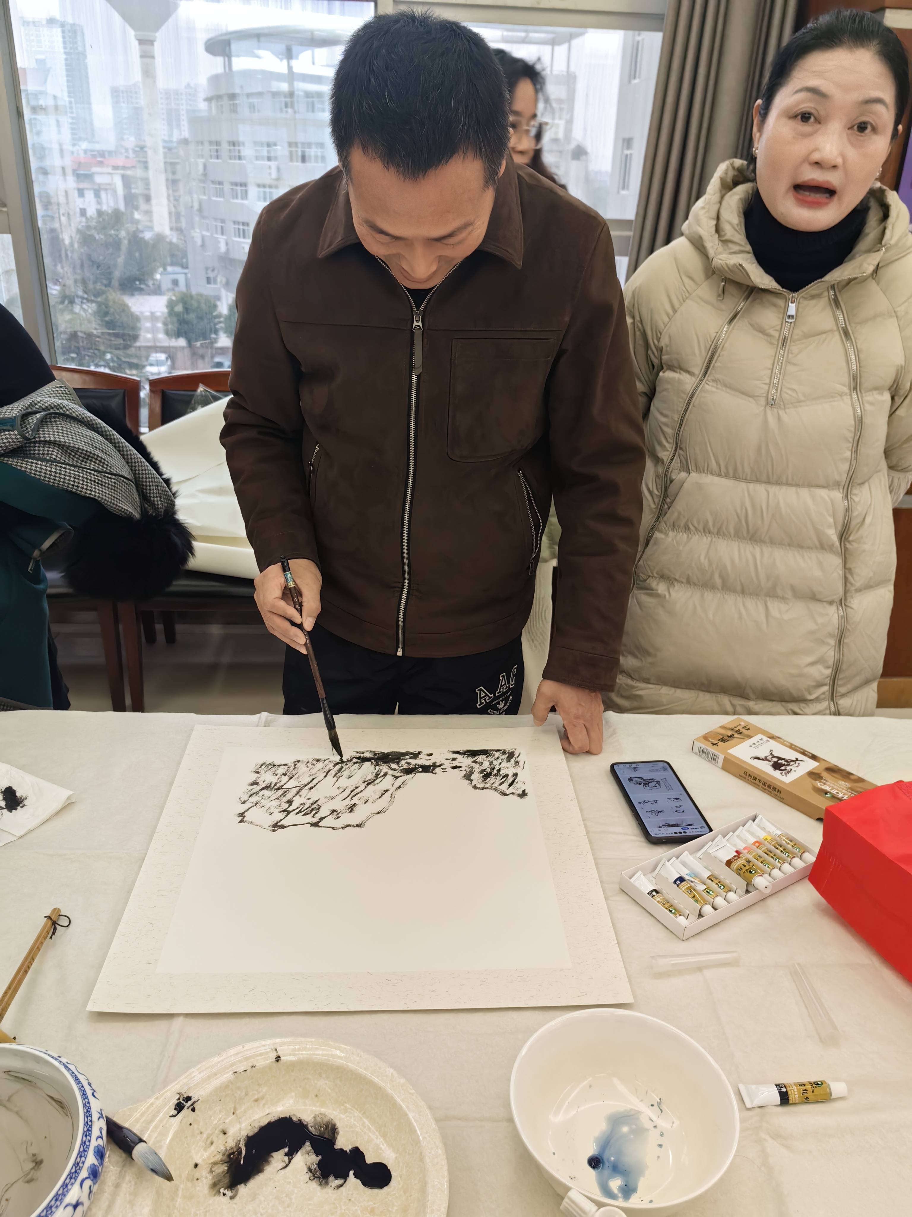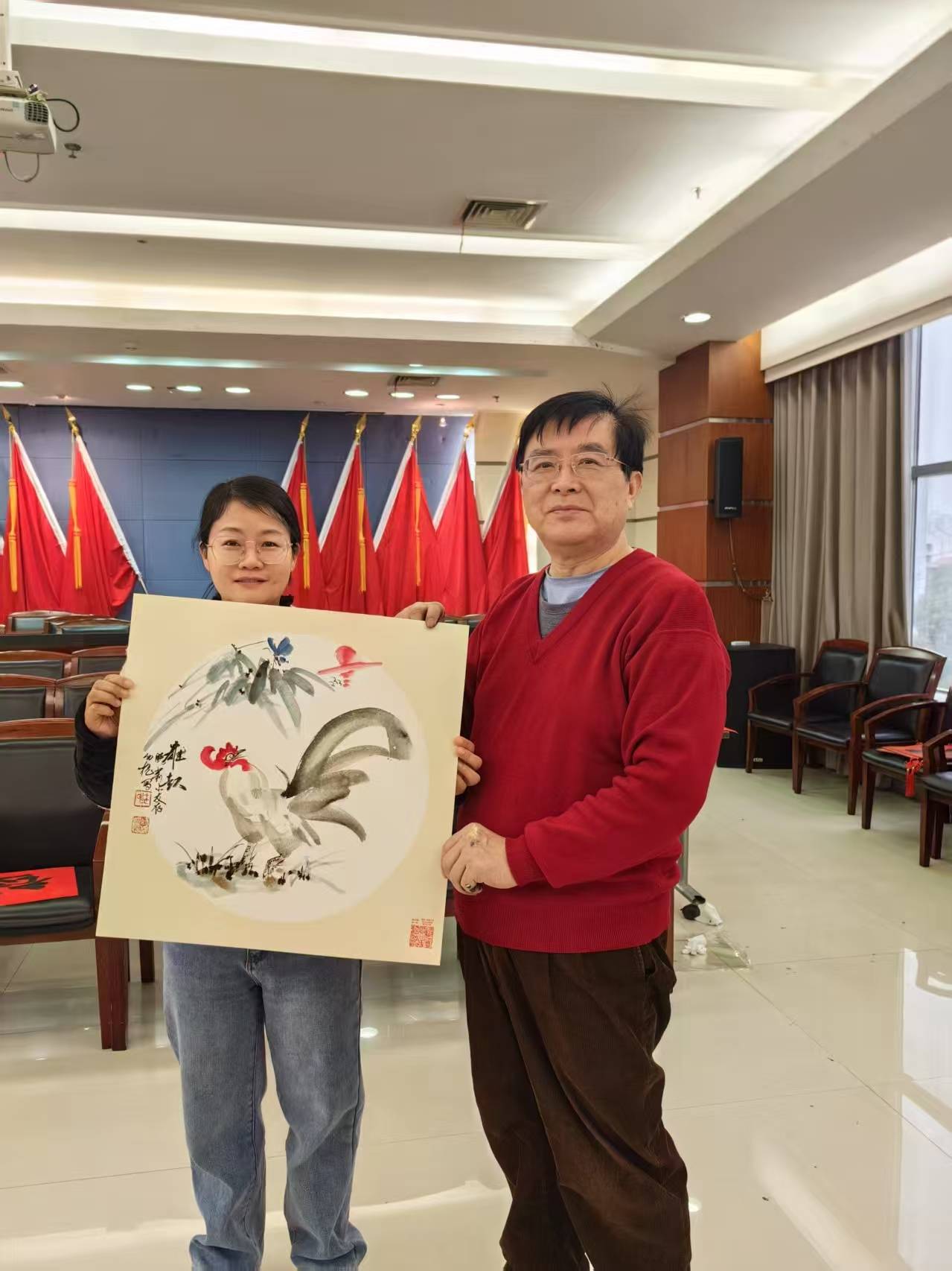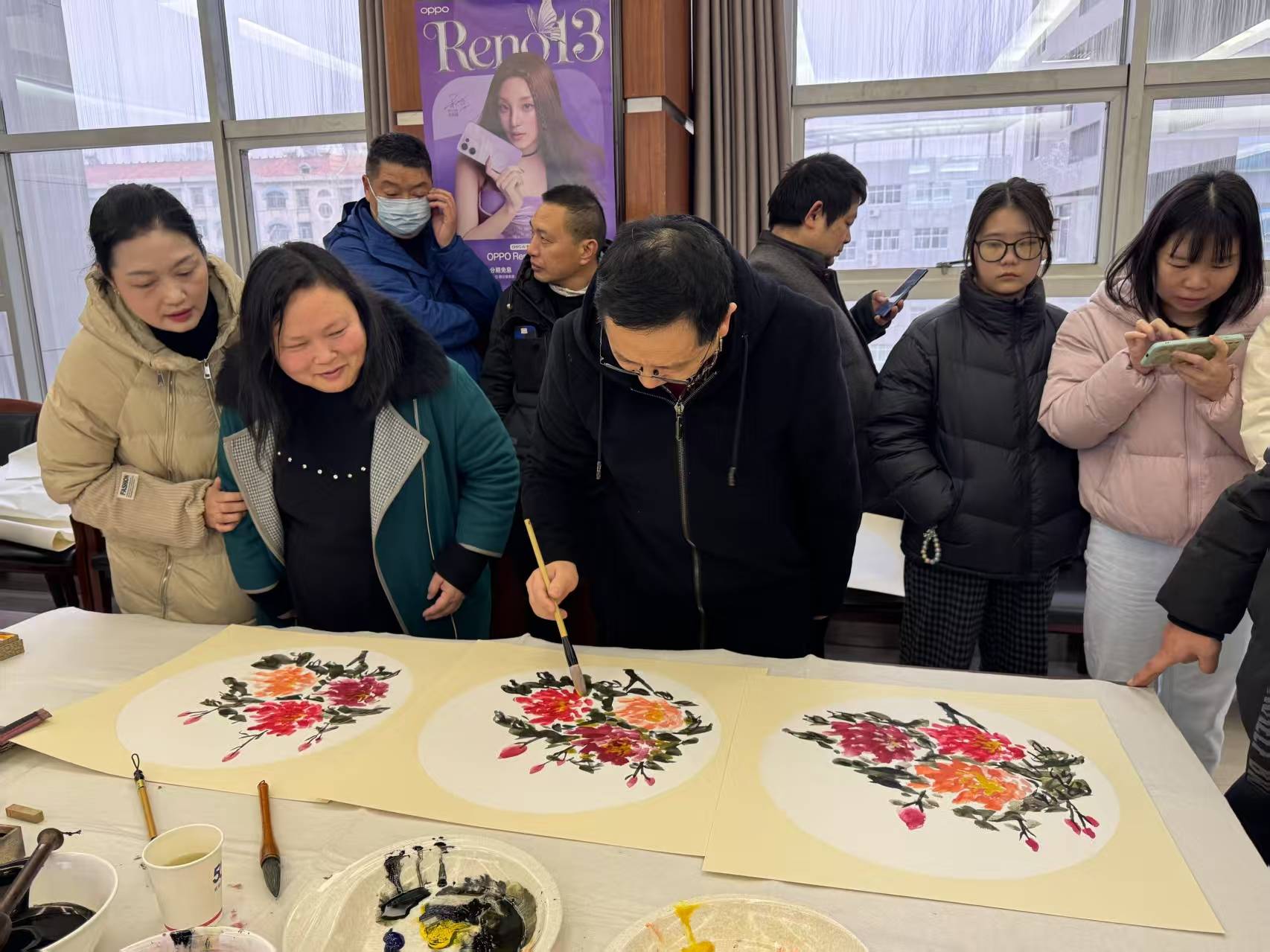 那一张张案台,成为了情感传递的桥梁;那排起的长长队伍,承载着员工们的热切期盼。员工们有的目不转睛地欣赏着书法家的豪迈挥笔,有的沉醉于画家的精彩创作。当拿到墨迹未干的福卡春联时,他们喜形于色,仿佛握住了新年的吉祥;捧着娇艳欲滴的牡丹,心花瞬间怒放,感受到生活的美好;抢到空灵淡雅的山水画,如获至宝,眼中满是对未来的憧憬。