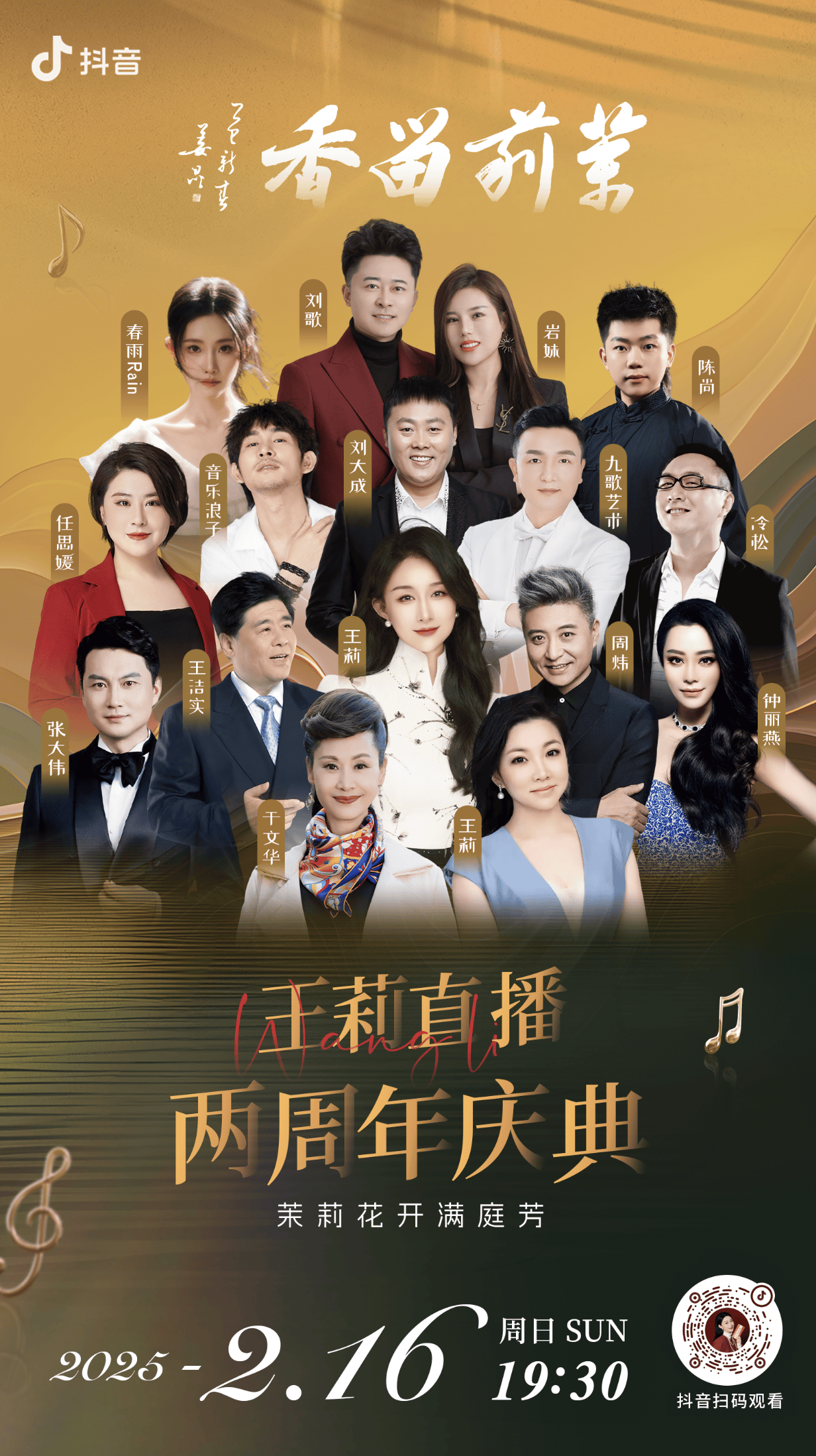 2024年2月16日晚7:30,优秀青年歌唱演员、抖音音乐人王莉的直播两周年庆典《茉莉留香》在万众期待中盛大开启,并于当晚圆满落幕。这场以“茉莉留香”为主题的艺术盛宴,不仅是对王莉从“直播小屏”迈向“央视大屏”辉煌跨越的深情总结,更以跨界交融的舞台创意、群星荟萃的表演阵容,为观众奉上一场视听震撼。著名相声表演艺术家姜昆亲笔题写主题《茉莉留香》,以墨韵寄寓王莉的艺术人生——如茉莉般清雅绽放,香远益清。