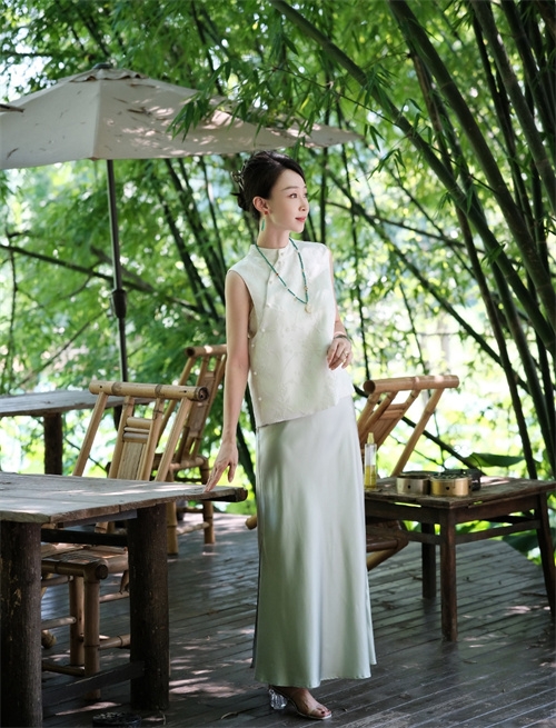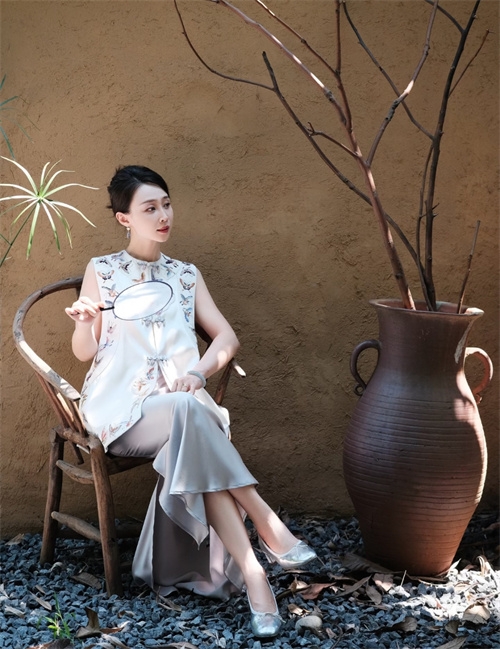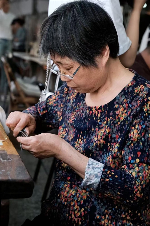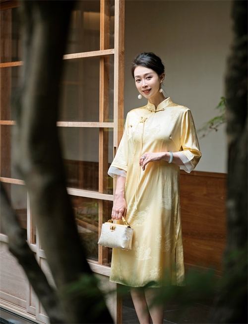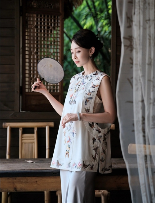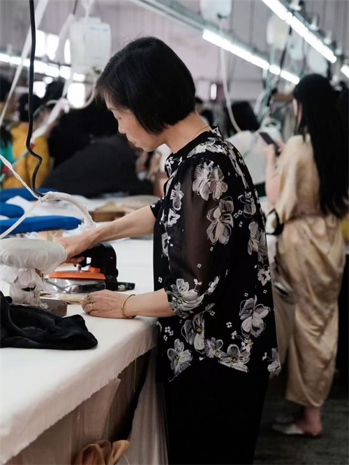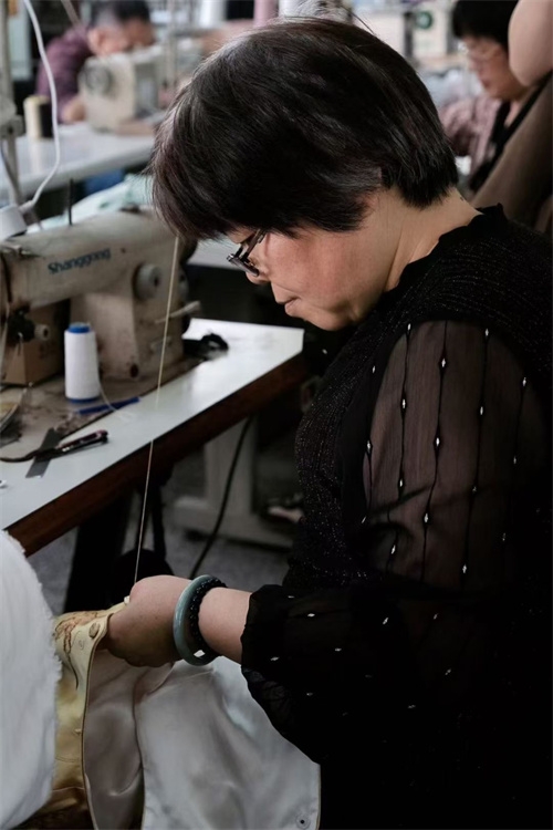 车间里,那支平均年龄50岁的红帮裁缝团队是品牌的底气。她们中,有的曾是上世纪制衣厂的老手艺人,剪刀起落间仍带着当年的精准;有的承继着家族的裁缝技艺,顶针的温度里藏着几代人的匠心。在这里,快时代的浮躁被挡在门外,她们坚持手裁每一件衣裳,让毕生功力顺着针线融进布料,连祝福都缝在了细密的针脚里。“好的面料是有治愈价值的,”主人笑着说,指尖划过一块云纱,“你看这质感,经得住时光磨洗,越穿越有味道。”