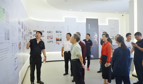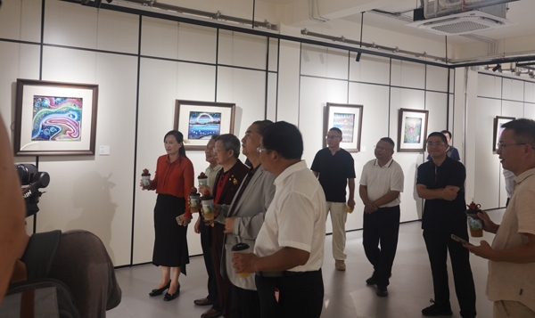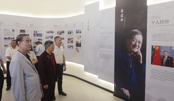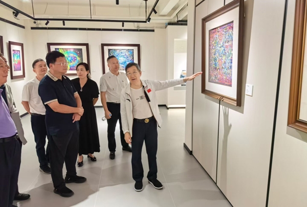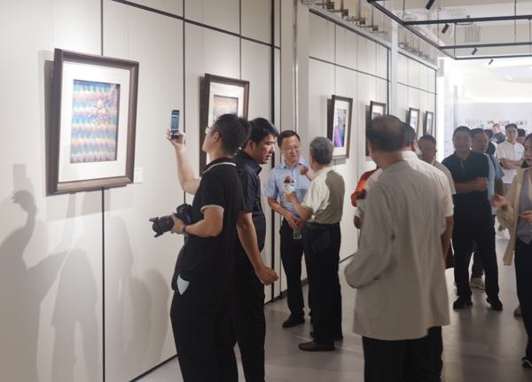 领导嘉宾听取黄小虎介绍黄建南艺术成就及作品