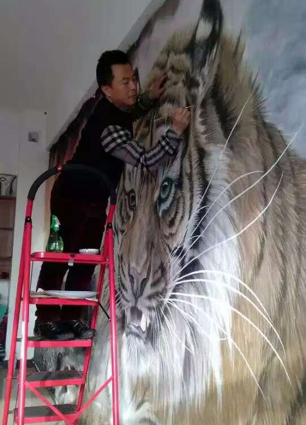 在历时三年创作《中华圣虎图》的那些日子里,卢成之天天在画室里架着一部木制云梯,上上下下,爬起倒卧,用各种姿势,从不同角度画虎的各个部位,技巧练达,细致精微,惟妙惟肖,呼之欲出,境界灵动。常常宵衣旰食,甚至挥毫泼墨,不分昼夜,吃睡伴虎同室。其情可感,其诚堪鉴。