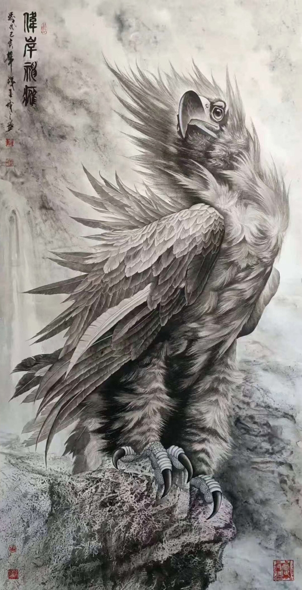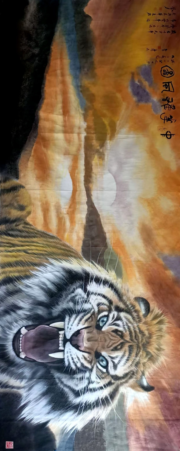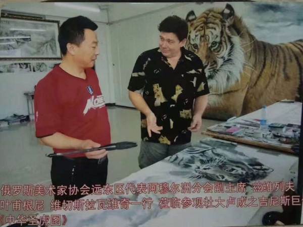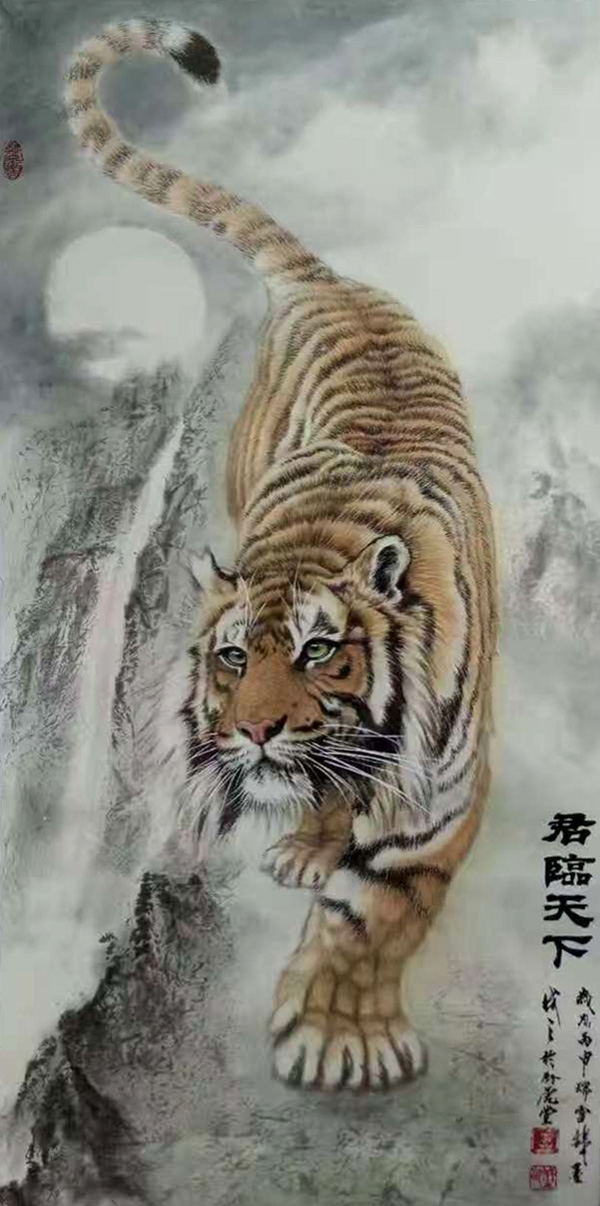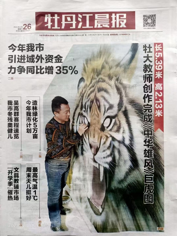 卢成之画虎,得到牡丹江大学领导师生的大力支持。做为牡丹江大学艺术学院美术教研室主任卢成之,感恩图报,羔羊跪乳,乌鸦反哺。他尽力传薪播火,教学相长,身体力行带徒弟,教情怀,教技艺,培养出一批批虎气生生的弟子。“山不在高,有仙则名。水不在深,有龙则灵。” 卢成之画虎扬名后转而画龙,虎跃龙骧,千载一人,乃天下之大才也。笔者以为,校方应该更好地为他提供条件,提高待遇,养住这条“大鱼”,帮助他创造第一流的工作,避免被别人挖走或北雁南飞。