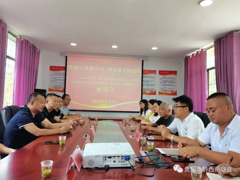 在党建联建座谈会上,大冲村村支书王勇介绍了大冲村村情村况以及产业发展情况;李震会长就大冲村在乡村振兴战略中产业发展上提出了指导性意见,应因地制宜,选好产业发展,真正帮助村民发展,村民的幸福感和获得感更加丰富多彩。其他两位董事长也就乡村治理上提出了指导性意见。最后,驻村第一书记邹蔚代表驻村工作队和村支两委对贵阳市黔西南商会暨爱心企业的捐赠表示感谢,他表示,商会暨企业的爱心捐赠让大冲村村民感受到党和政府的温暖关怀,在乡村振兴上充满信心,在今后的工作中将与村支两委一道带领村民共谋发展村的各项工作,不忘商会及企业的帮扶。