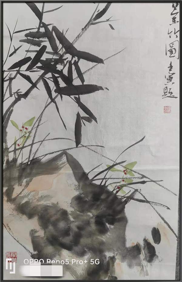 胡诚画竹,风竹、雨竹、雪竹、雾竹、兰竹、石竹,不一而足,或追凝重,趣色嫣丽,或求秀逸,清翠如水。其竹干,或刚劲挺拔,节节直立,尽是骨鲠之气,或柔韧婉转,婀娜多姿,万茎皆向自然;其竹叶秀逸洒脱,各逞其态,或墨重如泼,笔势横出,若有万千竹刀齐至,动人心魄,或墨淡如水,轻描淡写,宛若云中飞燕,声闻天外而余影悠悠。节生干间,浓墨处多说简淡;枝生节下,柔媚中尽是刚强。清雅澹泊,筛风弄月,是为谦谦君子,倔强沉实,不惧风雨,当作桀骜斗士。