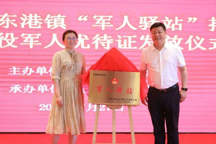 无锡市锡山区退役军人事务局局长刘人大,无锡晶石电子实业有限公司副董事长、无锡鼎尚酒店总经理冯芸为“军人驿站”揭牌