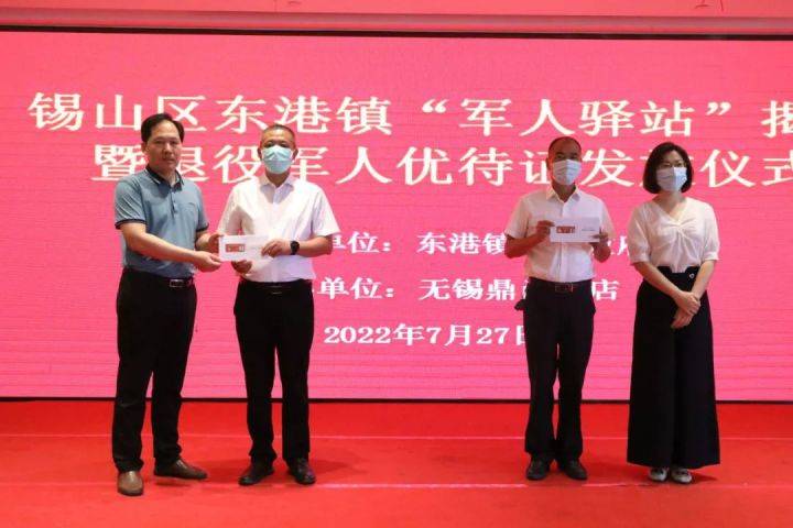 东港镇人民政府镇长高杰在讲话中说,东港镇退役军人服务站联合无锡鼎尚酒店,对落实“优待”政策进行了积极探索和有益尝试,率先在全区设立了“军人驿站”。未来,希望进一步扩大合作范围,不断优化完善优待服务政策,通过此次活动,希望在无锡鼎尚酒店的示范引领下,有更多的社会各界人士和企(事)业单位加入到东港“优待”现役军人、退役军人及其他优抚对象行列中来,让退役军人和其他优抚对象真正感觉到“领证光荣、用证舒心”,切实感受到镇党委、政府对退役军人的关怀,同时希望退役军人和其他优抚对象积极投身东港高质量发展实践中来!