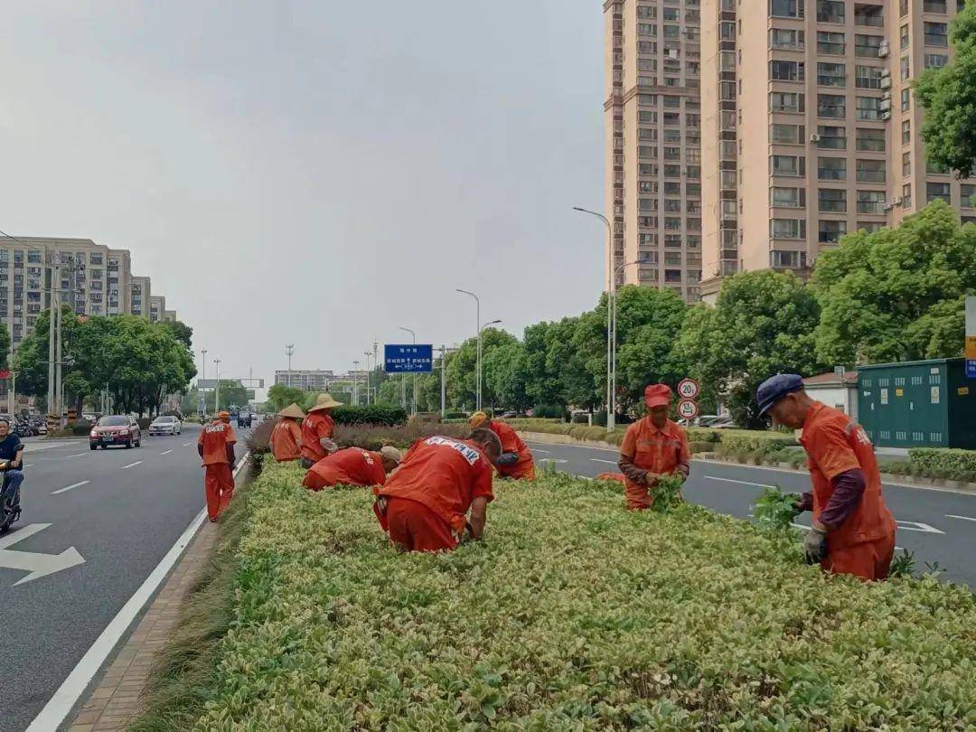 看,绿化大叔挥汗如雨修枝剪形、补植补栽;