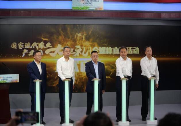 启动仪式现场,同步视频连线江苏、吉林、河南、广东、四川五个省的现代农业产业园并分享建设经验,农业农村部总艺师、发展规划司司长曾衍德和农业农村部计划财务司副司长时以群,中国农业电影电视中心党委书记、主任、总编辑宁启文,农业农村部规划设计研究院院长张辉,农业农村部农村社会事业发展中心主任潘利兵在活动现场共同为国家现代农业产业园大巡礼按下启动键!
