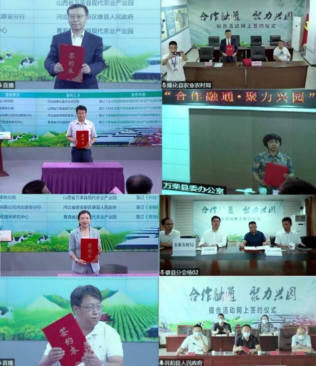 “千人同心,则得千人之力”,活动同期还举办了“合作融通、聚力兴园”撮合活动,助力产业园在科技、规划、金融、信息化技术等方面的发展。云签约仪式上,农业农村部规划设计研究院院长张辉与河北省隆化县农业农村局局长马青原代表双方签订《全过程咨询服务国家现代农业产业园创建合作协议》;中国农业科学院成果转化局局长赵玉林与山西省万荣县委书记李永辉代表双方签订《科技支撑万荣县国家现代产业园战略合作协议》;中国工商银行股份有限公司河北雄安分行副行长谌岚与河北雄安新区雄县国家现代农业产业园办公室主任孟凡寅代表双方签订《金融服务国家现代农业产业园合作协议》;国家农业信息化工程技术研究中心党总支书记张博与青海省共和县人民政府副县长吴斑代表双方签订《国家现代农业产业园战略合作协议》。