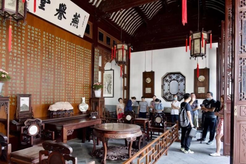 燕誉堂是园内主厅,用于主人会客,也是苏州园林中非常有名的鸳鸯厅。所谓鸳鸯厅,就是在一座大厅内用屏门和纱槅挂落隔成南北两部分,按功能分,冬春两季使用南厅,因向阳亦称暖厅。夏秋两季使用北厅,因避阳亦称凉厅。南北两厅相连,布置相异,那就让我们来找不同吧。南厅的梁柱是有雕刻的方木,北厅的梁柱是无雕刻的圆木;南厅的家具按正厅规格陈设,北厅正中有卧榻,较休闲;南厅铺地为菱形,北厅铺地为正方形;南厅大门上是透明玻璃,北厅大门上是彩色玻璃;南厅摆放立钟,北厅摆放立镜......你还能找到哪些不同呢?