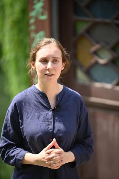 狮子林建筑分为祠堂、住宅和庭园三部分。入口处的门厅原是贝氏宗祠,于清末为贝家所建。Raquel和Yuliia看到了屋脊上的“福、禄、寿”雕塑,意为福星高照。Jeff则很快注意到了走廊的挂落上雕有花瓶图案,再仔细一看,花瓶两旁不就是贝叶吗?如果说花瓶寓意平安,那么贝叶图案又有什么寓意呢?原来,贝叶最初是用来抄写佛经的,而“贝”也是园主的姓氏,一语双关。贝叶是苏州园林中狮子林这座禅意园林特有的装饰图案。