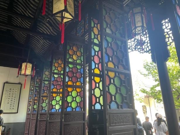西式建筑中常用的彩色玻璃,在苏州古典园林里似乎显得“格格不入”。而正是这些西方元素的融入,给粉墙黛瓦的古典园林增添了一抹亮色,也体现了狮子林中西合璧的特色。“和而不同,和合共生,美美与共”。