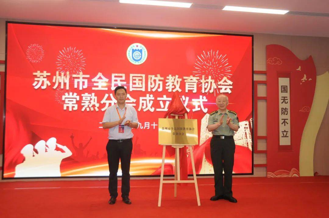 苏州市全民国防教育协会会长肖汉涛和苏州市全民国防教育协会常熟分会会长、苏州爱国有方文化发展有限公司董事长刘永明共同为分会揭牌。