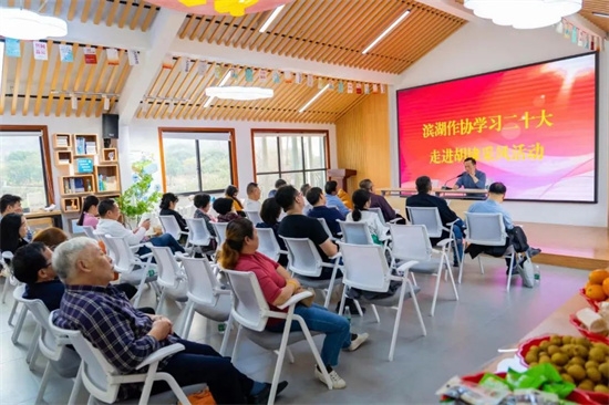2022年11月11日,无锡市滨湖区作家协会30多名会员在中国报告文学学会会员、无锡市滨湖区文联副主席、滨湖作协主席丁康权的带领下走进胡埭,开展“学习贯彻二十大精神,采风创作暨专家文学讲座”活动。本次活动由无锡市滨湖区文学艺术界联合会主办;滨湖区作家协会、滨湖区胡埭镇党群部共同协办。当天上午,滨湖作协的作家们参观了胡埭老街老桥、龙延村展史馆和九龙湾生态步道,对于胡埭镇的历史文化、经济发展有了较为清晰的认识。在龙延村展史馆中,作家们对于这一个四千余人口的村落竟发展出了几千亿产值的各类企业连连惊叹。在九龙湾生态步道,作家们切身感受到了胡埭镇人民政府在开发本土绿色生态资源和文化旅游资源的巨大投入和丰富产出。