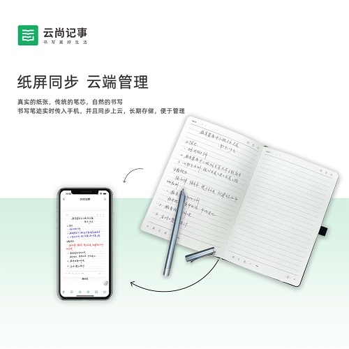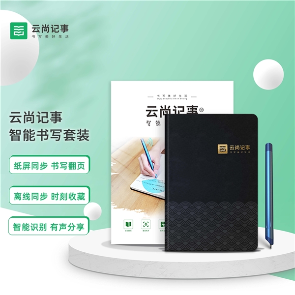 云尚记事智能书写套装是一套基于传统书写的智能笔记本套装,含一支智能笔、一个智能本,配合APP使用,实现传统书写与科技创新的完美融合。真笔真纸自然书写,笔记进入手机并上云端,传统记事,实时生成电子笔记,数字化管理,方便查找与分享。具有纸屏同步,云端管理;书写翻页,自动同步;功能点触,便捷操作;时刻收藏,标记存档;笔机分开,离线同步;书写录音,有声分享;手写笔迹,智能识别七大优势特点,是一款集科技型、实用性、时尚型和宣传性为一体的创新伴手礼。