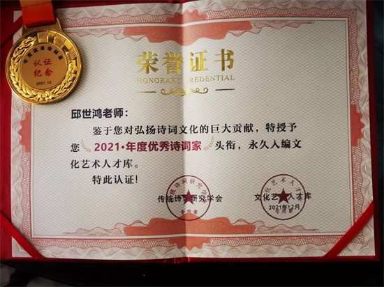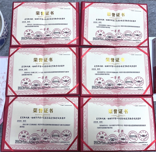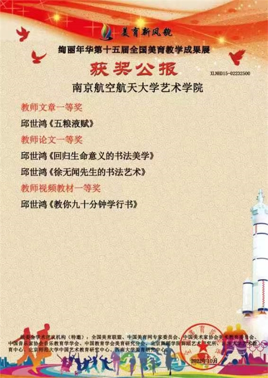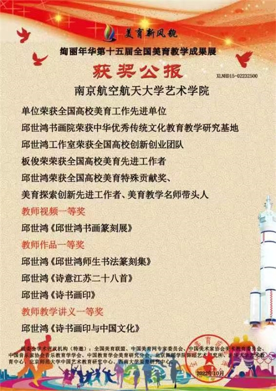 金秋十月,喜讯频传。在“绚丽年华·全国第十五届美育教学成果展”评奖活动中,邱世鸿教授喜获(九项)六个一等奖。内容包括视频、论文、创作、视频教学、文章等多方面。南航艺术学院因此获得“高校美育先进单位”荣誉称号;院长板俊荣获得“先进美育工作者”称号;邱世鸿个人获得“高校美育特殊贡献奖”、“美育探索创新先进工作者”、“美育教学名师带头人”三项荣誉。这是邱世鸿教接近十年来的综合成果,每一项都历经艰辛方有其成。如展览为2021年东莞举办的"西泠风华~邱世鸿书画篆刻展",历时十天,展出创作的诗词、书法、绘画、篆刻及著作系列,大获好评。创作为江苏艺术基金项目美术创作《诗意江苏二十八首》,尺过为200x225cm巨幅,诗书皆自创。《五粮液赋》为骈文,《教你九十分钟学行书》为连续讲座示范创作,论文《回归生命意义的书法美学》长达二万字,部分曾刊登于《中国书法》杂志。近期撰成《艺术美育与潜性教育》达一万五千字,作为苏州大学举办的全国美育研讨会专题论文,更深化了教育理念;《徐无闻先生的书法艺术》曾刊于《大学书法》杂志及《书法报》专题,是近著《徐无闻艺术研究》专著中一个子项;《邱世鸿师生书法篆刻集》是19号在昆山举办展览所出作品集,汇集师生四十余人二百余件作品。其它如《抚云斋诗文集》等,皆是平常创作之积累。总之,获奖者皆为艺术才华、才情、才思之积淀,反映出邱世鸿教授近年来的智慧结晶。