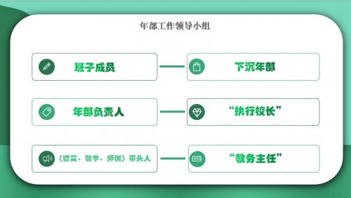 其次,在架构中,学校从功能角度将年部成员进行有效拆分。其中,班子成员亲自下沉到各年部对年部整体工作进行统筹规划;“年部负责人”相当于整个年部的“执行校长”,分管年部的大事小情、点滴日常;德育、教学、师训、后勤等带头人相当于教务主任,来支撑整个年部的高效运转。当然,以上岗位并不是一成不变,每学年,我们也将面向全体进行公开聘任,年部中对各个领域有专长的教师择优上岗,轮流坐庄。在整个过程中,那些服务意识强、管理水平高、工作成效好的小伙伴就会焕发活力、脱颖而出,而年部中其他的成员也会在成长共同体的格局下相互带动、同步成长。