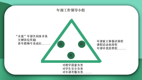 责权利的等边法则时刻将年部成员的利益放在首位,学校将权利放给了年部,年部又将权力放给了老师,从而实现了各年部自主管理、自发向上的良性循环。作为管理者,我们不仅仅看到了校园中一所所“小学校”欣欣向荣的美好愿景,同时也看到了一个个教育共同体、生态共同体和命运共同体的完美交融。