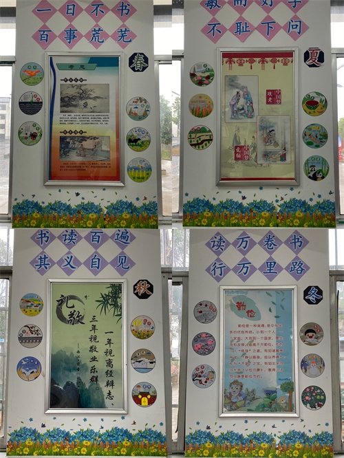 “让每一面墙都会说话”。教室的每一面墙,都应成为与学生心灵对话的窗口。因此在班级布置中应尽可能将墙体进行文化着装,突出书香班级主题特色。