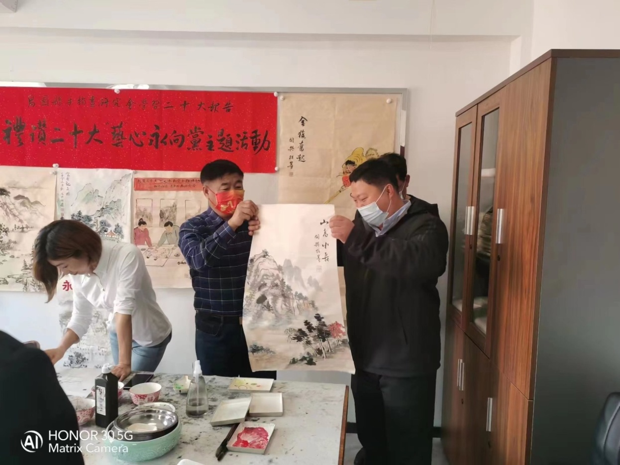在北街社区3楼社区书画室,同时举办着“礼赞二十大,'艺'心永向党”主题活动。县书画家关兴、张涛、孙海儒等老师及社区书画爱好者,在以现场书法和绘画的形式,围绕昌图镇城区建设、脱贫攻坚与乡村振兴、太阳山景色等主题,热情描绘了新时代昌图儿女开拓奋进取得的发展成就,展现了新时代昌图人民砥砺奋进、开拓进取、昂扬向上的精神风貌。通过本次书画展,激发了社区党员和居民奋进新征程,建功新时代的雄心壮志,凝聚起建设经济强县、美丽昌图的磅礴力量,为贯彻落实党的二十大精神营造了良好氛围,助力这次“主题”党日活动,并将现场所做书画作品赠送给热心的党员和群众。