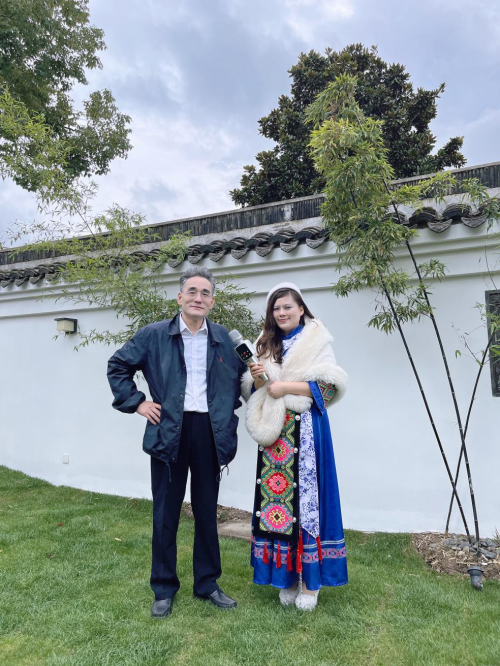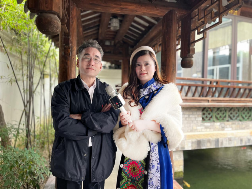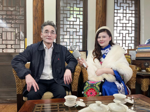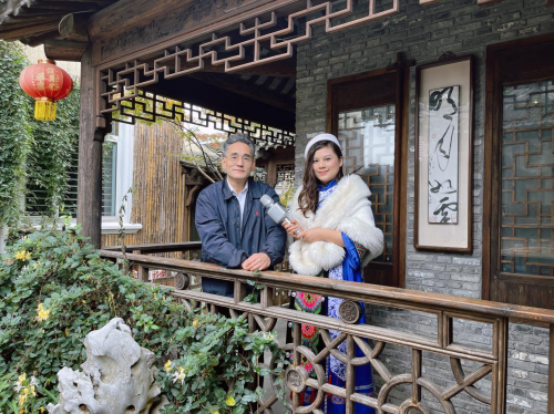 《盈盈之声》创始人杨盈盈在采访中还了解鹤良老师在创新书法作品的同时又创作打磨出自己绘画作品的新范式“绿色系列”。绿色系列水墨画,迄今已日臻完美娴熟,达到传承创新中见个性特色,言简意赅中可纵情挥洒的艺术境界。在国内独树一帜,自成一家,国际上传播甚远,广受关注。他的 “桂林农家”的创作特色是远山泼墨、写意,直至融入天际,升腾出深远的意境。近山则趋实,用工笔、色彩、浓淡区分,勾勒出自远而近的视线。山下森林是过渡,虚实之间,用线条、色彩,自然地拉近、接近,直至见房屋、见人烟,用细腻的工笔,渐暖的色调,烘托出农家生活主题,给人以温暖和宁静。近处的水面,以绿水荷叶、红花点缀,细密的竹林,夸张变形,高耸入云,布满画面,在虚实中摇曳,增加画面的立体感、层次感 ,为画添得几分静谧和意境。而“绿荷清韵”虽为画荷,与“桂林农家”却有异曲同工之妙,顶端横书蝇头无边书法和红印数点,平染几分文人的书卷气,最终形成鹤良绿色系列的经典画作。