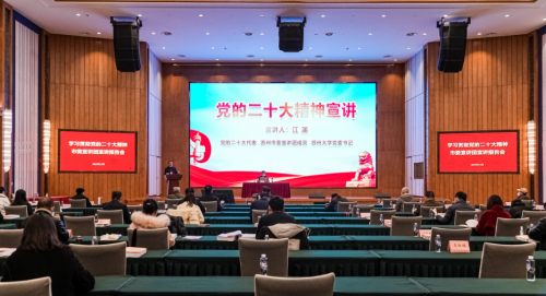 会上,中国共产党第二十次全国代表大会代表、苏州市委宣讲团成员、苏州大学党委书记江涌教授作宣讲报告,并以《深入学习贯彻党的二十大精神》为题,结合自身的参会经历,着重围绕深刻认识党的二十大的重大意义、深刻领会党的二十大精神以及全面贯彻落实党的二十大精神三个方面作了讲解。