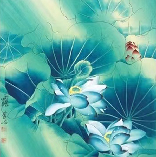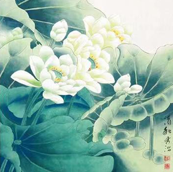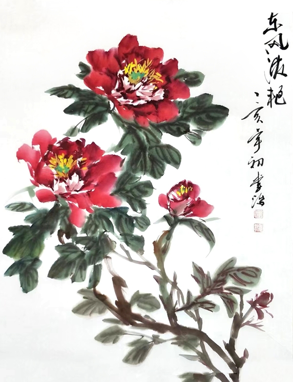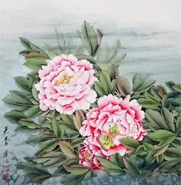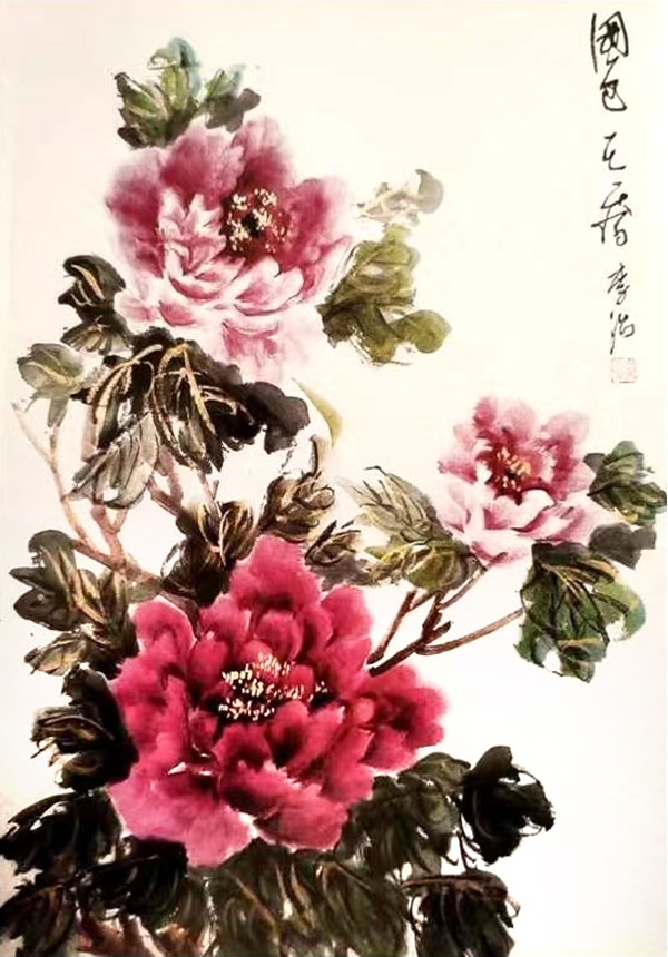 牡丹秀骨清像,超凡脱俗,气韵生动,浪漫高华,充满了和谐雅致的诗情画意。画面通透流畅,色彩鲜明统一,描绘精致精妙。面对画卷,读者仿佛看到了国色天香的美,嗅到了清气袭人的香,触到了春风轻拂的柔。李先生的牡丹以油画的遮盖和透明技巧,展现牡丹色彩之丰富,立体感之饱满;以传统国画的勾勒和染色,突出牡丹雍容华贵,风神绰约的骨气风神,构建出恬淡冲和、富贵吉祥的大雅风度。这种中西结合的表现形式,是李先生对中西方艺术无数次探索与实践的结晶;是对倾国名花物化于心,外化天形的执着追求与真情流露;更是他内心深处对古今中外文化与思想的反复碰撞与深刻思考。