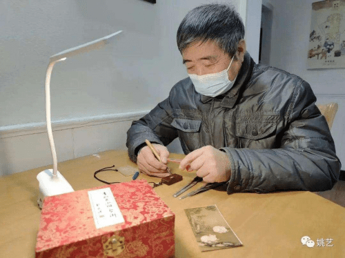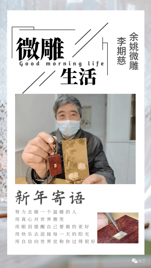 余姚兔年微雕 浙江余姚微雕艺术家李期慈1月10日完成了一件贺岁刻品——微雕《梧桐双兔图》(仿古画)。这件刻品刻在9毫米长、5毫米宽的仿象牙片上,镶嵌在吊牌饰件的木块中。